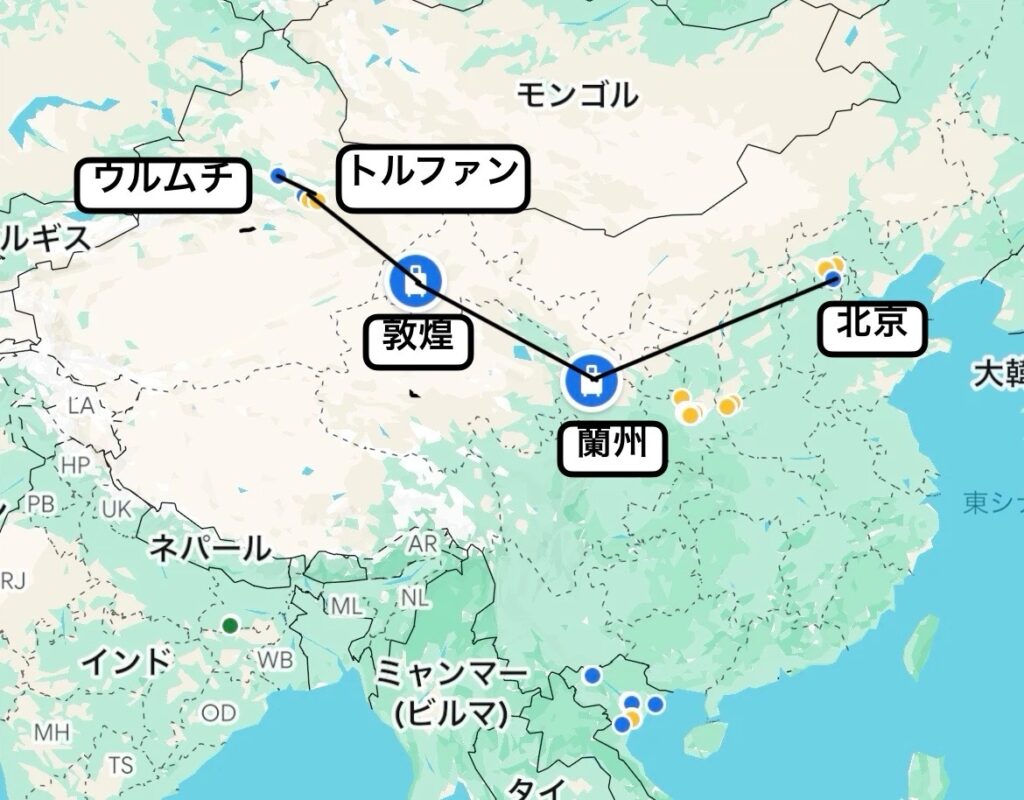 今回のルートは「北京 → 蘭州 → 敦煌 → トルファン → ウルムチ」。すべて硬臥(寝台)か硬座(座席)を利用します。安さを最優先にした結果です。飛行機を使えばもっと楽に移動できますが、僕たちは「鉄道で進むからこそ感じられる景色の変化」に惹かれました。